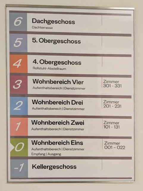 Während der Umbauten nahmen sich einige Entscheider im Haus einen kurzen Moment und versuchten inmitten unzähliger Entscheidungsprozesse, eine schnelle neue Namens-Lösung zu finden. Die schnelle Lösung kam, und die Wohnbereiche hießen kurzerhand Wohnbereich 1, 2, 3 und 4 – entsprechend der Etagen – vermeintlich. Schnell ging man zum nächsten Tagesordnungspunkt über, denn die Benennung der Wohnbereiche erschien nicht so schwierig, wie andere Umbau-bezogene Themen. Außerdem passte es gut, die Telefonnummern und andere Daten hier zuzuordnen: Wohnbereich 1 bekommt Telefon-Durchwahl 100. Alles geklärt – die Struktur nahm ihren Lauf…